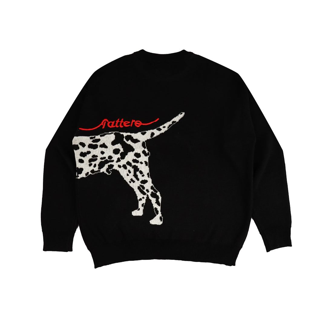 Dalmatian Snug Sweater from the Giddy Lucky Giggly collection is an acrylic cotton-like sweater featuring a split dalmatian graphic flowing from front to back, finished with a necklace detail ending in a bold Pattero embroidery. Designed for a casual, playful statement. Made in Indonesia.